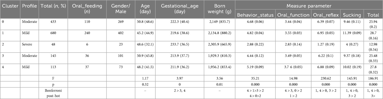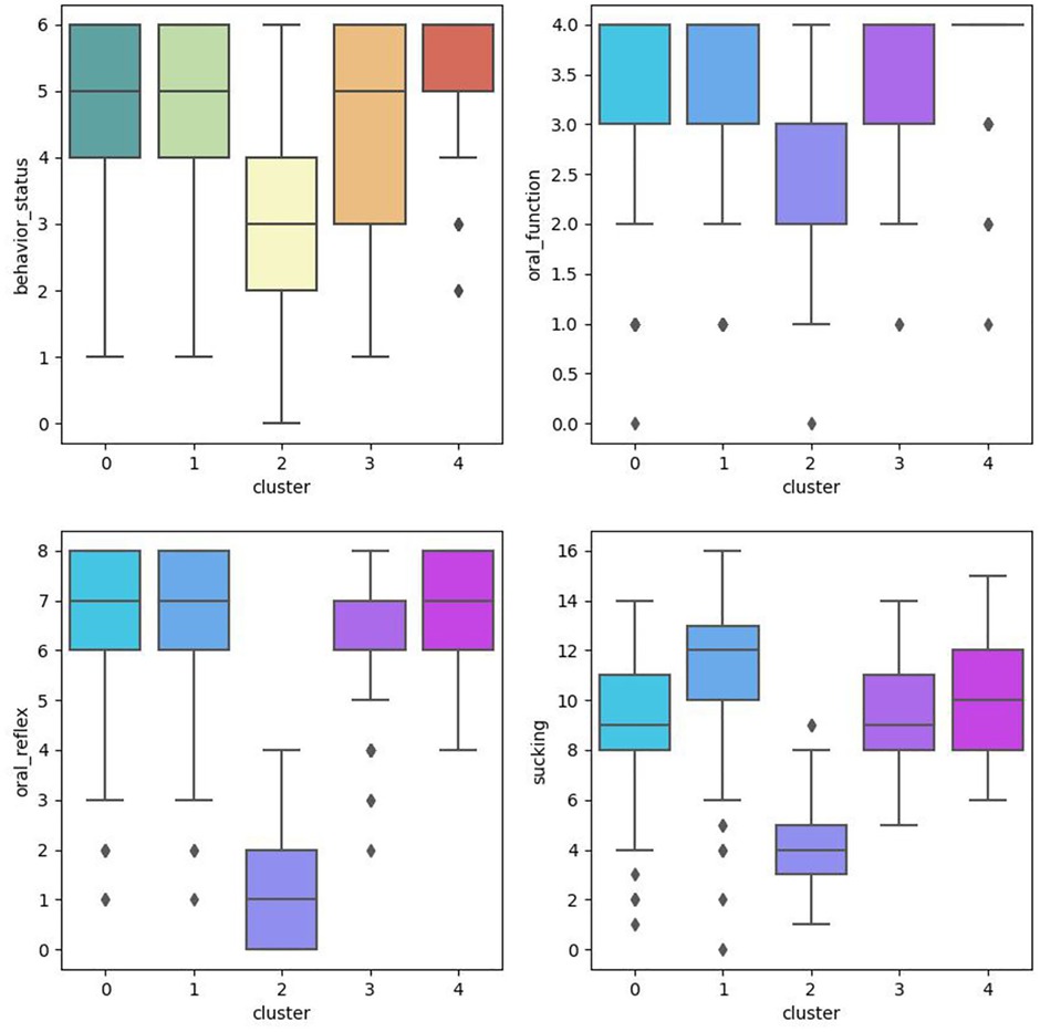 Cluster 1 and 4 were scoring the highest points in PIOFRA, and cluster 2 performed the worst compared to other clusters. In the mild groups, cluster 1 stood for participants displays the worse performance in behavior status, and cluster 4 represented those with suboptimal sucking behaviors. No significant difference was found among these clusters in born weight and age. Only the severe group displayed the longest gestational days compared to cluster 3 and 4.