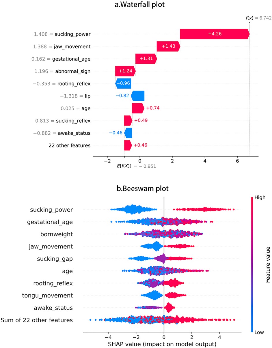 To visually illustrate the feature impacts, this study would provide some typical examples. Figure 1a shows that sucking power contributed the largest impact on prediction accuracy, then Figure 1b shows that, as sucking power increases, SHAP values show increasing trend and indicate higher possibility of achieving oral feedings. Figure 1a also shows that rooting reflex produced the largest negative impact, and Figure 1b shows that some participants with more optimal rooting reflex tend to display worse oral feeding performance.