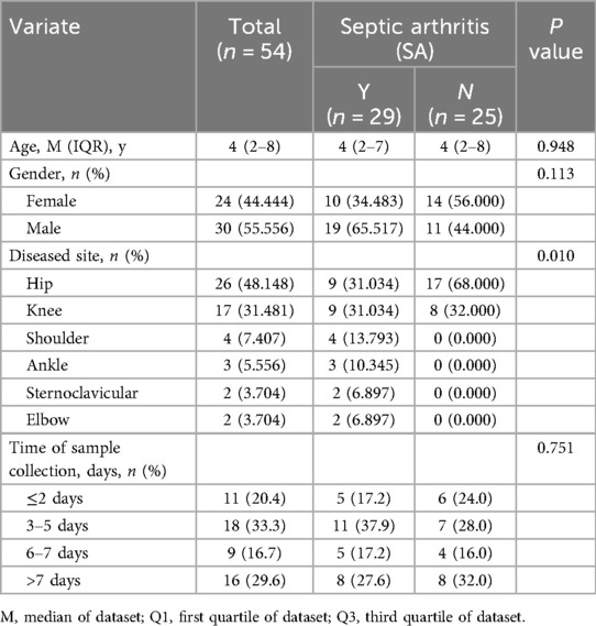 Between January 2019 and December 2021, 67 patients presenting with acute joint erythema, swelling, warmth, and pain were considered for this study. After applying the exclusion criteria, a final cohort of 54 children were enrolled in the study. The sample size was determined based on the following factors: the low incidence rate of septic arthritis in this region (approximately 10 cases per year); strict inclusion and exclusion criteria to ensure high diagnostic accuracy and consistency among the enrolled cases; limited research time; and the single-center experimental design.