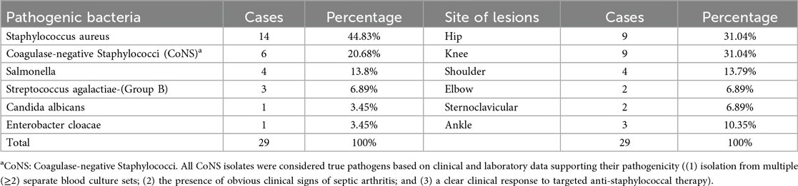 Based on positive synovial fluid culture results, 29 children were ultimately diagnosed with septic arthritis (SA). For the 25 patients with negative cultures, a comprehensive evaluation including clinical presentation, laboratory findings, and imaging results led to a final diagnosis of transient synovitis (TS) as the cause of their non-septic arthritis (NSA). The outcomes of all synovial fluid bacterial analyses and lesion locations are presented in the subsequent tables (Table 2).