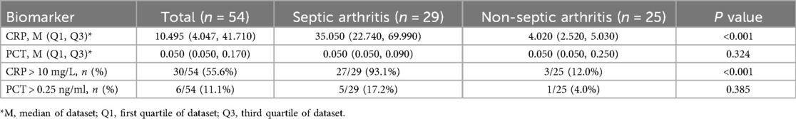 Results: CRP levels (>10 mg/L) were significantly higher in the septic arthritis group than in the non-septic group (26/29 vs. 3/25, P < 0.001), whereas PCT levels (>0.25 ng/ml) showed no significant difference (5/29 vs. 1/25, P = 0.385). ROC analysis revealed a high diagnostic performance for CRP (AUC 0.950, 95% CI 0.886–0.995, Youden index 88.6%) compared with PCT (AUC 0.574, 95% CI 0.417–0.731, Youden index 17.2%), indicating the superior sensitivity and specificity of CRP for early diagnosis of septic arthritis.