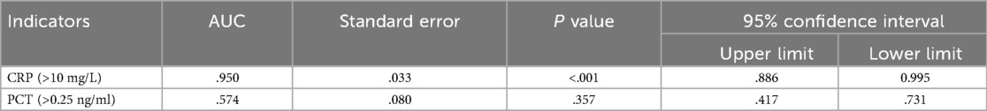 The diagnostic performance of CRP and PCT for septic arthritis was evaluated using numerical measurements and the construction of receiver operating characteristic (ROC) curves (Figure 1). The area under the ROC curve (AUC) for CRP was 0.950 (95% CI, 0.886–0.995), corresponding to a Youden's index of 88.6%. The optimal cutoff value for CRP was determined to be 6.49 mg/L, which was associated with a sensitivity of 96.6% and a specificity of 92%. For PCT, the AUC was 0.574 (95% CI, 0.417–0.731), with a Youden's index of 17.2%. The optimal cutoff value for PCT was 1.29 ng/ml, with a sensitivity of 17.2% and specificity of 100%. The detailed findings are presented in Table 4.