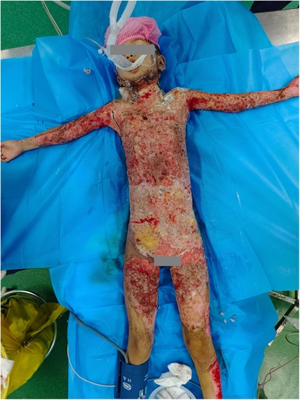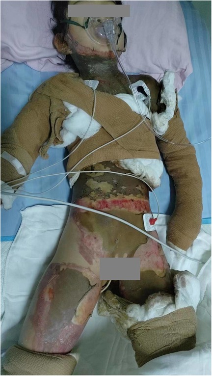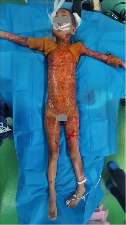 The child had sustained flame burns affecting multiple areas of the body, primarily the trunk, face, neck, both upper and lower limbs, perineum, and buttocks. Most burn wounds had a leather-like appearance, with areas exhibiting reduced sensation and numbness. Some wounds showed a pale base, moderate exudation, and contamination. The TBSA affected was approximately 50% (Figure 1). Laboratory tests revealed a white blood cell count of 27.51 × 109/L, hemoglobin level of 13.2 g/dl, platelet count of 159 × 109/L, C-reactive protein level of 40.86 mg/L, procalcitonin level of 25.71 ng/L, and albumin level of 26 g/L. Clinical diagnosis indicated multiple third-degree and fourth-degree burns caused by flame exposure—covering 50% of the TBSA—and hypovolemic shock.