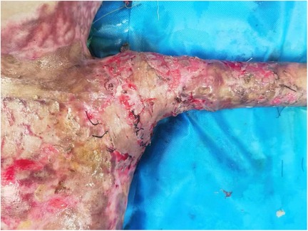 In accordance with the calculation for burn area in the Lund-Browder diagram, burn wound depth evaluation by the ABA, and burn degree classification by Li Ao Burn Science (1, 8, 12), the child was diagnosed with an extremely severe burn with TBSA of 50% and third- to fourth-degree burns.