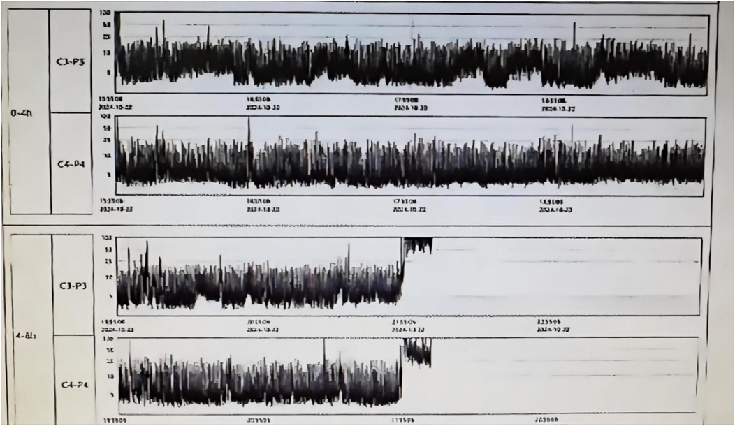 Figure 1. Neonatal brain function monitoring report on the second day of life, showing moderately abnormal electroencephalographic activity.