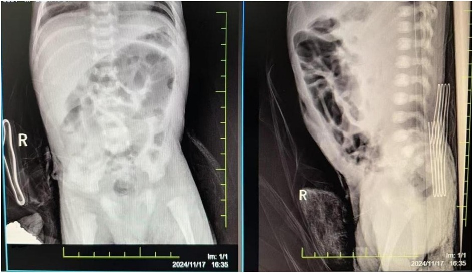 The damage to the gastrointestinal system is due to the redistribution of blood flow initiated to protect more critical organs, with significant reduction in intestinal blood supply. This leads to edema, increased permeability, ulceration, necrosis, and bleeding of the gastrointestinal mucosa, gastrointestinal dysfunction, and reperfusion damage, resulting in particularly severe intestinal injury. Severe asphyxia-related gastrointestinal damage is positively correlated with the incidence of multiple organ dysfunction (2). Although protective measures, including fasting, were implemented for the gastrointestinal system after admission, the infant developed necrotizing enterocolitis with perforation on the fourth day after birth (see Figure 2). Intraoperatively, extensive congestion and edema of the small intestine from 10 cm to 40 cm from the ileocecal valve were observed, covered with purulent exudate, with poor intestinal wall elasticity; intestinal wall rupture, edema of the mesenteric root, and numerous gas bubbles were visible. An ileal resection, intestinal anastomosis + ileostomy (Santulli procedure) + abdominal drainage were performed. After confirming the return of intestinal function, breastfeeding was initiated on the fourth day after surgery, gradually increasing milk volume to full enteral nutrition. Subsequently, due to the development of cholestasis, the feeding was changed to an extensively hydrolyzed milk formula after consultation with a gastroenterologist. On the 21st day after surgery, the infant again had bloody stools, and an abdominal radiograph suggested recurrent necrotizing enterocolitis (see Figure 3). Immediate fasting was initiated, and parenteral nutrition support was started, along with cefoperazone/sulbactam for anti-infection treatment.