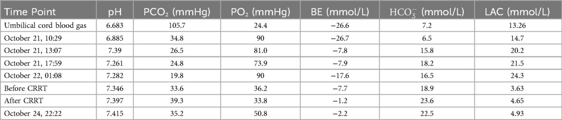 The mechanism of cardiac injury involves adenosine triphosphate (ATP) depletion, calcium overload, and the release of cardiac troponin I (cTnI) in myocardial cells due to hypoxia, leading to circulatory system disorders characterized by anuria, severe metabolic acidosis, unstable blood pressure, and acute kidney injury (AKI), manifesting as neonatal shock and renal failure (16, 17). After admission, volume expansion and infusion of vasoactive drugs (dopamine, norepinephrine, epinephrine) were administered to stabilize blood pressure and correct acidosis. CRRT in CHDF mode was initiated 12 h and 28 min after birth, concurrently with therapeutic hypothermia. A detailed summary of the arterial blood gas analysis from admission to CRRT treatment is provided in Table 1. Elevated cardiac enzyme spectrum and troponin levels indicated myocardial damage, and fructose-1,6-diphosphate was administered for myocardial nutrition to promote cardiac function recovery.