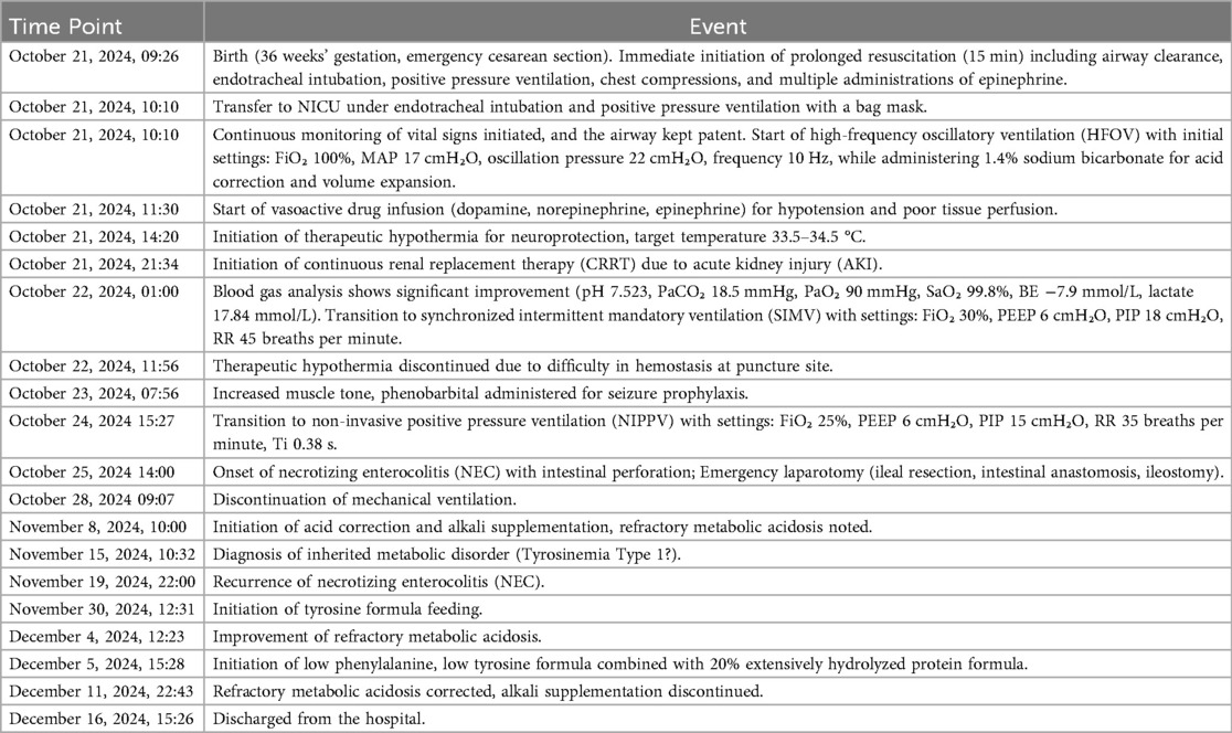 While this case report provides detailed insights into the management of severe neonatal asphyxia and MODS, it is important to acknowledge its limitations. The findings are based on a single case, which limits the generalizability of the results. The absence of a control group and the lack of long-term follow-up data mean that the long-term outcomes and potential sequelae of the interventions described cannot be fully assessed. Additionally, the genetic testing did not identify pathogenic variants associated with tyrosinemia, which introduces some uncertainty regarding the definitive diagnosis. Future studies with larger cohorts and longer follow-up periods are needed to validate these findings and better understand the implications of metabolic disorders in neonatal asphyxia.