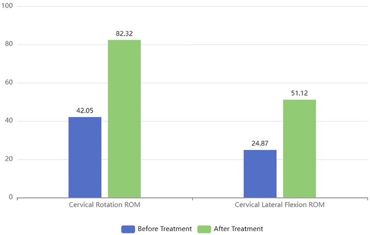 Cervical ROM: After M&MFE treatment, the infants' cervical ROM (including lateral flexion and rotation) significantly improved (P = 0.03, Table 2). The significant improvement in cervical ROM (both rotation and lateral flexion) after treatment indicates that the combined therapy effectively restored neck mobility, which is crucial for the normal development of infants with CMT (Figure 1).