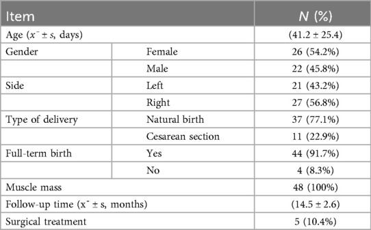 A total of 48 patients met the inclusion and exclusion criteria, including 26 females and 22 males. The age at initial treatment ranged from 21 to 135 days, with a mean of 41.2 ± 25.4 days. There were 21 cases with left-side involvement and 27 cases with right-side involvement. 37 infants were delivered vaginally, and 11 were delivered by cesarean section. 44 infants were full-term, and 4 were preterm. All patients had palpable masses in the SCM. All patients were followed up for 13–20 months, with a mean follow-up duration of (14.5 ± 2.6) months. Relevant demographic characteristics are shown in Table 1.