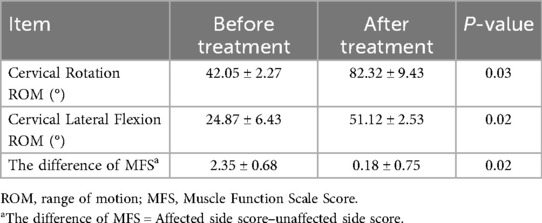 Cervical ROM (including lateral flexion and rotation) and muscle function scale were used to evaluate the clinical efficacy of the treatment (20). Follow-up was conducted for at least 1 year from the initial treatment. Surgical evaluation: If neck passive movement was restricted with rotation >6° or lateral flexion >6° after treatment, surgical indications were assessed by a specialist.