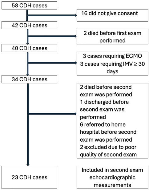 Between January 2021 and March 2024, a total of 58 CDH neonatal cases were surgically treated at Karolinska University Hospital. Forty-two cases were included in the study; two died shortly after birth, before an echocardiographic examination was performed. A total of 40 CDH cases had a first study protocol echocardiogram performed between 6 and 24 h of age. The control group (n = 40) consisted of newborns from the maternity ward (n = 36) and included newborns with anomalies not likely to affect the heart, such as anal atresia and esophageal atresia (n = 4). Among the CDH cases, 24 underwent a second echocardiogram at 2–5 weeks of age. One case remained on ECMO at the time of the second examination and was therefore excluded from the analysis of echocardiographic parameters. The CDH subgroup undergoing an examination at 2–5 weeks of age was matched with controls (n = 23) from the original control group, who also underwent a second echocardiogram at 2–5 weeks of age. Reasons for exclusion are displayed in Figure 1.