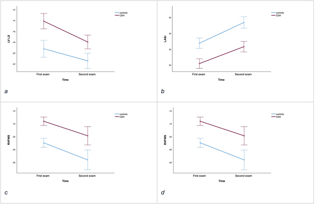 Figure 2 visualized that strain improved in both groups over time, yet CDH cases consistently showed reduced strain compared to the controls at each time point (Table 3).