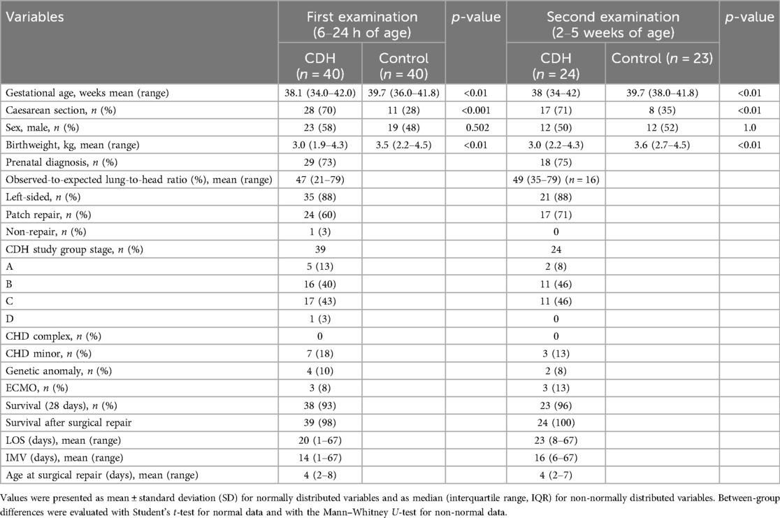 This was a prospective observational cohort study including a control group. All medical data were retrieved from medical records at the Karolinska University Hospital. Echocardiographic examinations were first performed at between 6 and 24 h after birth in a cohort of neonates with CDH (n = 40) and an age-matched control group (n = 40). Examinations were also performed at a second timepoint, at 2–5 weeks of age, in a subgroup of the CDH group (n = 24) and the control group (n = 23). At Karolinska University Hospital, all children born at term in need of mechanical support, including nasal continuous positive airway pressure, are treated in the PICU. This study was designed and reported in accordance with the STROBE (Strengthening the Reporting of Observational Studies in Epidemiology) guidelines to ensure clarity and transparency (27).