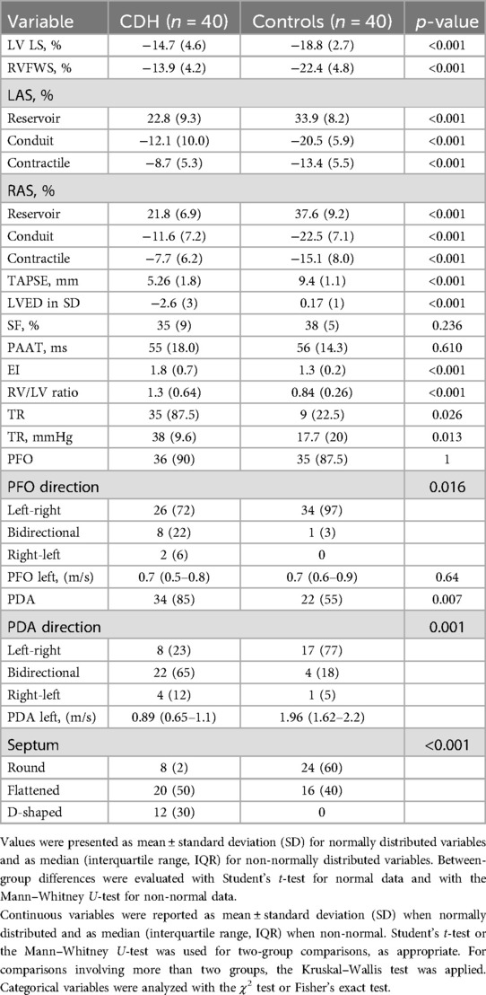 This study included a cohort of 40 neonates born with CDH between January 2021 and March 2024 and treated at Karolinska University Hospital, Stockholm, Sweden. The control group consisted of 40 newborns, either with surgical conditions not related to the heart or healthy newborns, cared for in the maternity ward. All children included in the control group were cared for at Karolinska University Hospital. All participants were enrolled after verbal and written information was provided to the caregivers and written consent was obtained. The hernia severity was assessed prenatally based on observed-to-expected lung-to-head ratio and postnatally based on the need for patch and defect size (28). A few children born with CDH needed tracheostomy and long-term IMV, due to pulmonary hypoplasia and complications due to mechanical ventilation including tracheal stenosis rather than cardiac dysfunction. Therefore, in this study, neonates with more than 30 days' duration of IMV were excluded from certain echocardiographic measurements. Major congenital heart defects were defined as severe heart defects present at birth that significantly affect heart function and require surgery within the first year. These were also an exclusion criterion.