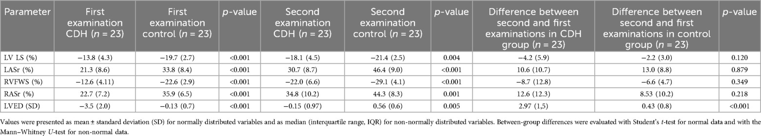 The differences in strain and LVED measurements between cases and controls at the first and second examinations, along with the changes in these measurements between examinations, are shown in Table 3.