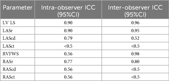 Table 5 reports the intraclass correlation coefficient (ICC) for echocardiographic strain measurements. ICC ≥ 0.9: Excellent reliability, 0.75 ≤ ICC < 0.90: good reliability, 0.5 ≤ ICC < 0.75 moderate reliability, <0.5 poor reliability (38).