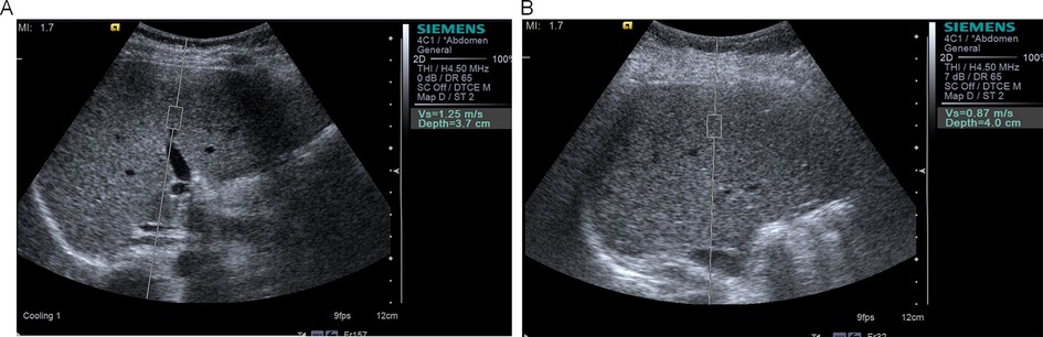 Ultrasound parameters: All ultrasound examinations were performed by a senior radiologist with over 10 years of experience in pediatric vascular ultrasonography. The examiner was certified by the Chinese Medical Doctor Association and the Chinese Society of Ultrasound Medicine, trained per standardized protocols (12). Measurements followed technical guidelines: (1) Fasting >3 h; (2) Supine position with right arm maximally abducted; (3) Probe perpendicular to liver capsule with light pressure; (4) Sampling depth 3–6 cm below Glisson's capsule, avoiding vessels >3 mm. A Siemens S2000 color Doppler ultrasound system (linear probe frequency: 10 MHz; convex probe frequency: 4.5 MHz) was used to measure the following parameters: carotid IMT: participants were placed in the supine position, and the IMT was measured at 12 sites (bilateral common carotid artery, bifurcation, and proximal/distal internal carotid artery), with the mean value calculated. FMD: The brachial artery was selected as the target vessel. The baseline diameter (Bd) and postreactive hyperemia diameter (Fd) were measured, and FMD was calculated as (Fd−Bd)/Bd × 100%. Arterial elasticity parameters: Systolic pressure (Ps), diastolic pressure (Pd), and carotid artery diameter changes (Ds, Dd) were synchronously recorded to calculate the elasticity coefficient (Ep), stiffness β, distensibility coefficient (DC), and arterial compliance (AC). Liver stiffness measurement: Shear wave velocity (SWV) was measured using acoustic radiation force impulse (ARFI) imaging. Five measurements were taken in the right anterior liver lobe (while avoiding vascular structures), and the mean value was calculated and reported in m/s. Young's modulus (E) was calculated from SWV using the formula represents SWV (12), with results expressed in kilopascals (kPa). The representative image of liver elasticity measured by ARFI technology is shown in Figure 1. Carotid artery ultrasound measurements for vascular elasticity assessment were performed as shown in Supplementary Figure S1. The methodology for obtaining carotid artery parameters, including intima-media thickness and blood flow velocity measurements, is illustrated in Supplementary Figure S2.