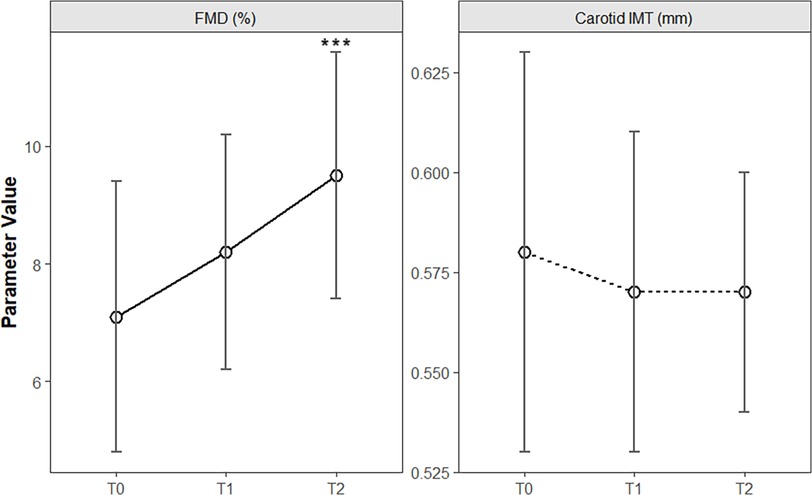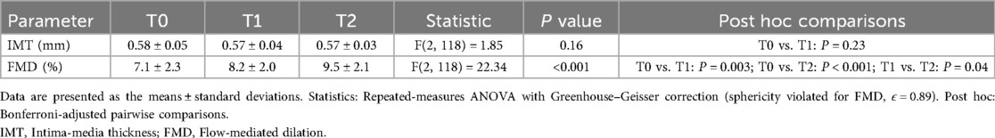 Longitudinal analysis across baseline (T0), 6 months (T1), and 12 months (T2) demonstrated phased improvements in vascular structure and function. The IMT slightly decreased from 0.58 ± 0.05 mm at T0 to 0.57 ± 0.03 mm at T2, but the overall change lacked statistical significance [F(2, 118) = 1.85, P = 0.16]. In contrast, FMD significantly improved from 7.1 ± 2.3% at T0 to 8.2 ± 2.0% at T1 and 9.5 ± 2.1% at T2, with a significant time main effect [F(2, 118) = 22.34, P < 0.001]. Post hoc tests (Bonferroni-adjusted) confirmed significant differences between T0 and T1 (P = 0.003) and between T0 and T2 (P < 0.001), indicating early vascular endothelial function improvement by 6 months (Table 2 and Figure 2).