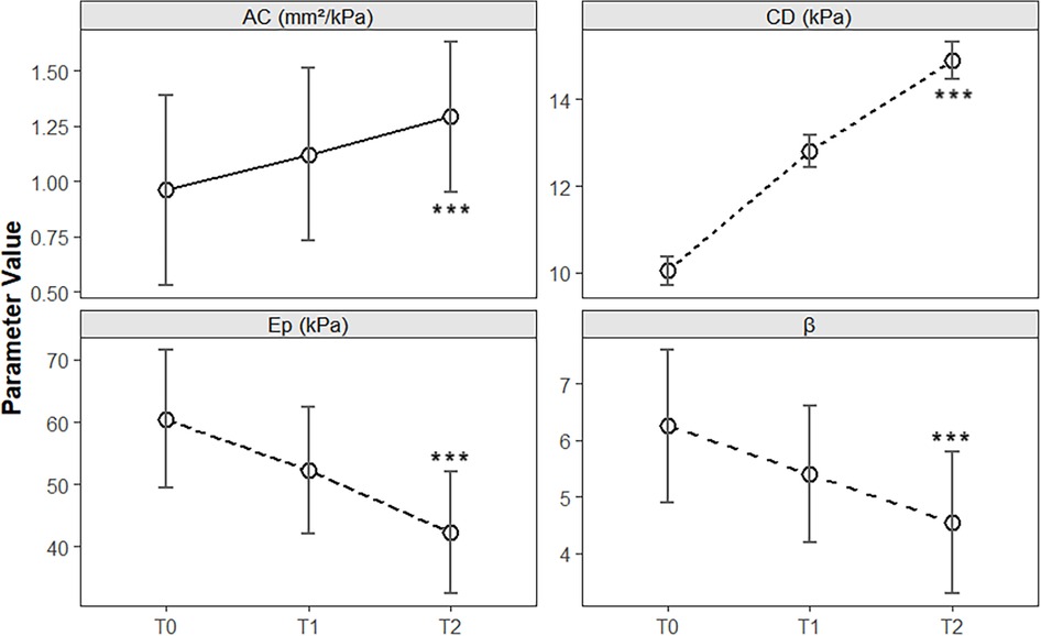 Four line graphs depict changes in parameter values over time points T0, T1, and T2. The top left graph shows an increase in AC (mm²/kPa). The top right graph shows an increase in CD (kPa). The bottom left graph indicates a decrease in Ep (kPa), and the bottom right graph shows a decrease in β. Error bars and significant differences, marked with asterisks, are present.