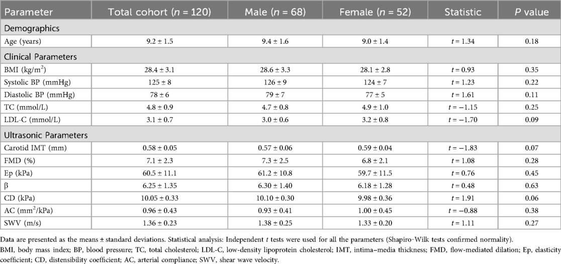 During the 12-month intervention period, 12 participants (10.0%) were lost to follow-up due to relocation (n = 7), withdrawal of consent (n = 3), or inability to comply with scheduled visits (n = 2). The study enrolled 120 children with obesity, including 68 males (56.7%) and 52 females (43.3%). Baseline clinical and ultrasound parameters revealed a mean BMI of 28.4 ± 3.1 kg/m2 and systolic and diastolic blood pressures of 125 ± 8 mmHg and 78 ± 6 mmHg, respectively, with total cholesterol (TC) and LDL-C levels exceeding normal pediatric reference ranges. Ultrasound measurements revealed an IMT of 0.58 ± 0.05 mm, FMD of 7.1 ± 2.3%, and SWV of 1.36 ± 0.23 m/s. Gender comparisons revealed no statistically significant differences in BMI, blood pressure, or ultrasound parameters between males and females (P > 0.05), confirming baseline homogeneity (Table 1).