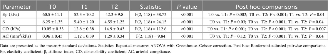 Postintervention arterial elasticity parameters were markedly improved. Ep decreased from 60.5 ± 11.1 kPa at baseline to 52.3 ± 10.2 kPa at T1 and 42.3 ± 9.8 kPa at T2 [F(2, 118) = 38.72, P < 0.001]. β decreased from 6.25 ± 1.35 to 4.55 ± 1.25 at T2 [F(2, 118) = 24.15, P < 0.001], whereas CD and AC increased significantly from 10.05 ± 0.33 kPa to 14.9 ± 0.43 kPa [F(2, 118) = 112.6, P < 0.001] and 0.96 ± 0.43 mm2/kPa to 1.29 ± 0.34 mm2/kPa [F(2, 118) = 9.84, P < 0.001], respectively. Post hoc tests revealed significant improvements in Ep, β, and CD by T1 (P < 0.05), whereas AC improved only by T2 (Table 3 and Figure 3).