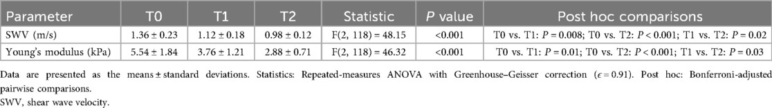 Liver SWV and derived Young's modulus (E) significantly decreased after intervention. The baseline SWV (1.36 ± 0.23 m/s) and E (5.54 ± 1.84 kPa) indicated elevated liver stiffness. After 6 and 12 months of intervention, SWV decreased to 1.12 ± 0.18 m/s (E: 3.76 ± 1.21 kPa) and 0.98 ± 0.12 m/s (E: 2.88 ± 0.71 kPa), respectively, with significant time main effects [SWV: F(2118) = 48.15, P < 0.001; E: F(2118) = 46.32, P < 0.001], confirming time-dependent improvements in liver stiffness (Table 4).