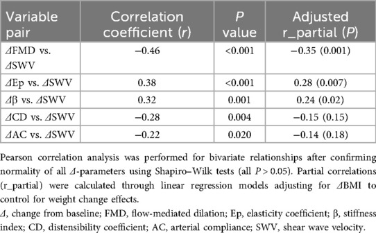 Correlations between changes in vascular function (ΔFMD, ΔEp, Δβ, ΔCD, and ΔAC) and liver stiffness (ΔSWV) were analyzed. The ΔFMD was significantly negatively correlated with the ΔSWV (r = −0.46, P < 0.001), suggesting that vascular endothelial improvement is associated with a reduction in liver stiffness. Additionally, ΔEp (r = 0.38, P < 0.001) and Δβ (r = 0.32, P = 0.001) were positively correlated with ΔSWV. To account for potential confounding by weight change, partial correlation analyses adjusting for ΔBMI were performed. After adjustment, ΔFMD remained negatively correlated with ΔSWV (r_partial = −0.35, P = 0.001), while ΔEp (r_partial = 0.28, P = 0.007) and Δβ (r_partial = 0.24, P = 0.02) retained positive correlations with ΔSWV. The associations for ΔCD (r_partial = −0.15, P = 0.15) and ΔAC (r_partial = −0.14, P = 0.18) became nonsignificant. These findings suggest that the deterioration of arterial elasticity parallels the progression of liver fibrosis (Table 5).