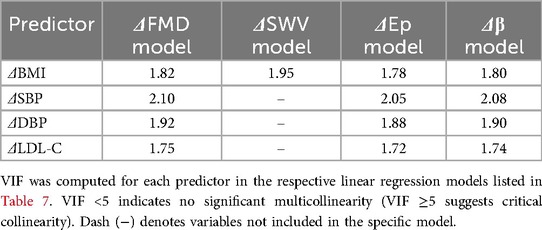 Multivariate models adjusted for multicollinearity (VIF <5 for all predictors) were used to assess the independent effects of weight change (ΔBMI) and clinical indicators on vascular and hepatic improvements (Table 6). ΔBMI independently predicted ΔFMD (β = 0.32, P = 0.003) and ΔSWV (β = −0.41, P < 0.001), indicating that weight loss directly enhances vascular repair and liver softening. ΔSBP independently influenced ΔEp (β = 0.18, P = 0.04) and Δβ (β = 0.15, P = 0.03), suggesting that blood pressure control partially mitigated arterial stiffening (Table 7).