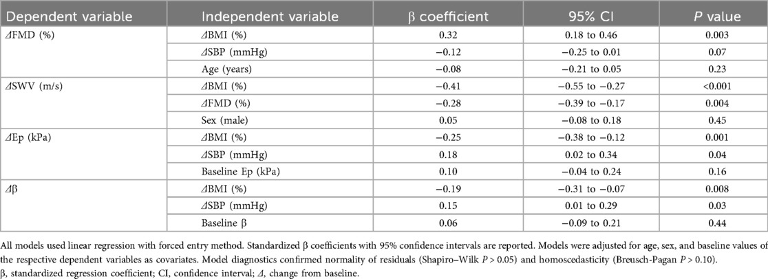 Results: Significant improvements were observed in FMD (7.1%–9.5%, P < 0.001), Ep (60.5 kPa–42.3 kPa, P < 0.001), β (6.25–4.55, P < 0.001), CD (10.05 kPa–14.9 kPa, P < 0.001), AC (0.96–1.29 mm2/kPa, P < 0.001), and SWV (1.36 m/s–0.98 m/s, P < 0.001). The carotid IMT did not significantly change (Δ = −0.01 mm, P = 0.16). Multivariate regression identified ΔBMI as an independent predictor of ΔFMD (β = 0.32, P = 0.003) and ΔSWV (β = −0.41, P < 0.001).