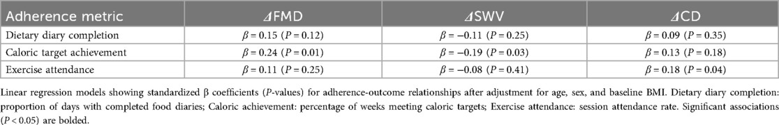 Dietary adherence averaged 85.4% (SD, 8.2%) for diary completion and 78.2% (SD, 9.5%) for caloric targets. Exercise attendance was 89.6% (SD, 7.3%). Regression models demonstrated that higher dietary adherence predicted greater ΔFMD (β = 0.24, P = 0.01) and ΔSWV reduction (β = −0.19, P = 0.03), while exercise adherence independently associated with ΔCD improvement (β = 0.18, P = 0.04) (Table 8).