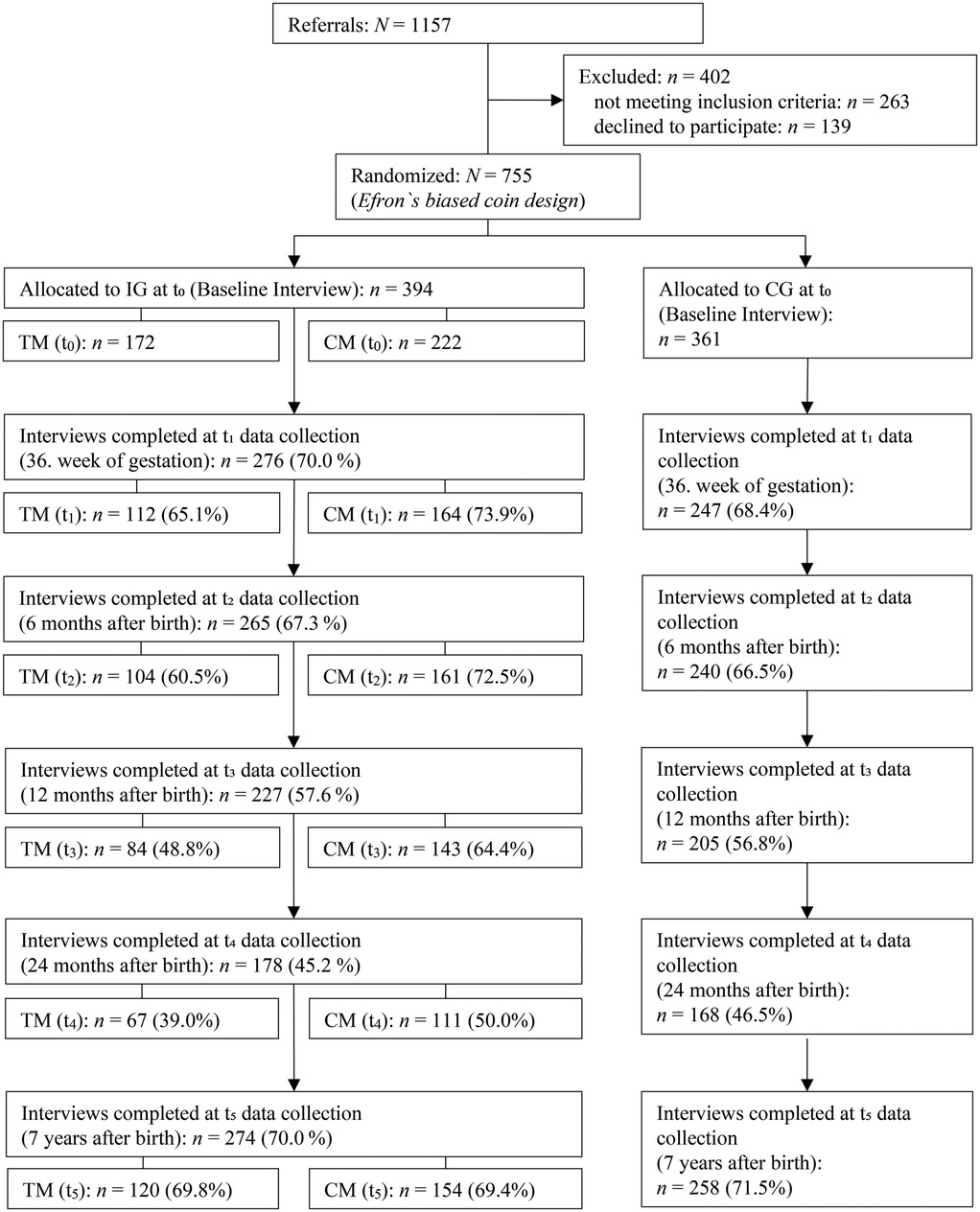 Flowchart detailing a randomized study of 1,157 referrals. 402 were excluded, leading to 755 participants randomized using Efron’s biased coin design. Participants were allocated into two groups: IG (n = 394) and CG (n = 361). Each group underwent interviews at multiple data collection points: baseline, 36 weeks gestation, and 6, 12, 24 months, and 7 years post-birth. Completion percentages for IG ranged from 39.0% to 70.0%, while CG ranged from 46.5% to 71.5% across time points.
