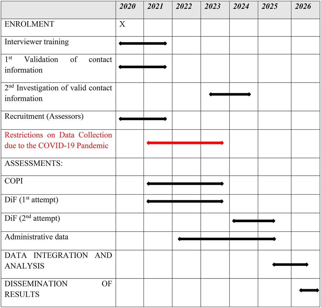 Timeline chart showing the schedule for a study from 2020 to 2026. Activities include interviewer training, contact information validation and investigation, and assessor recruitment. COVID-19 restrictions, marked in red, span 2020 to 2021. Assessments and data processes are shown from 2020 to 2026.
