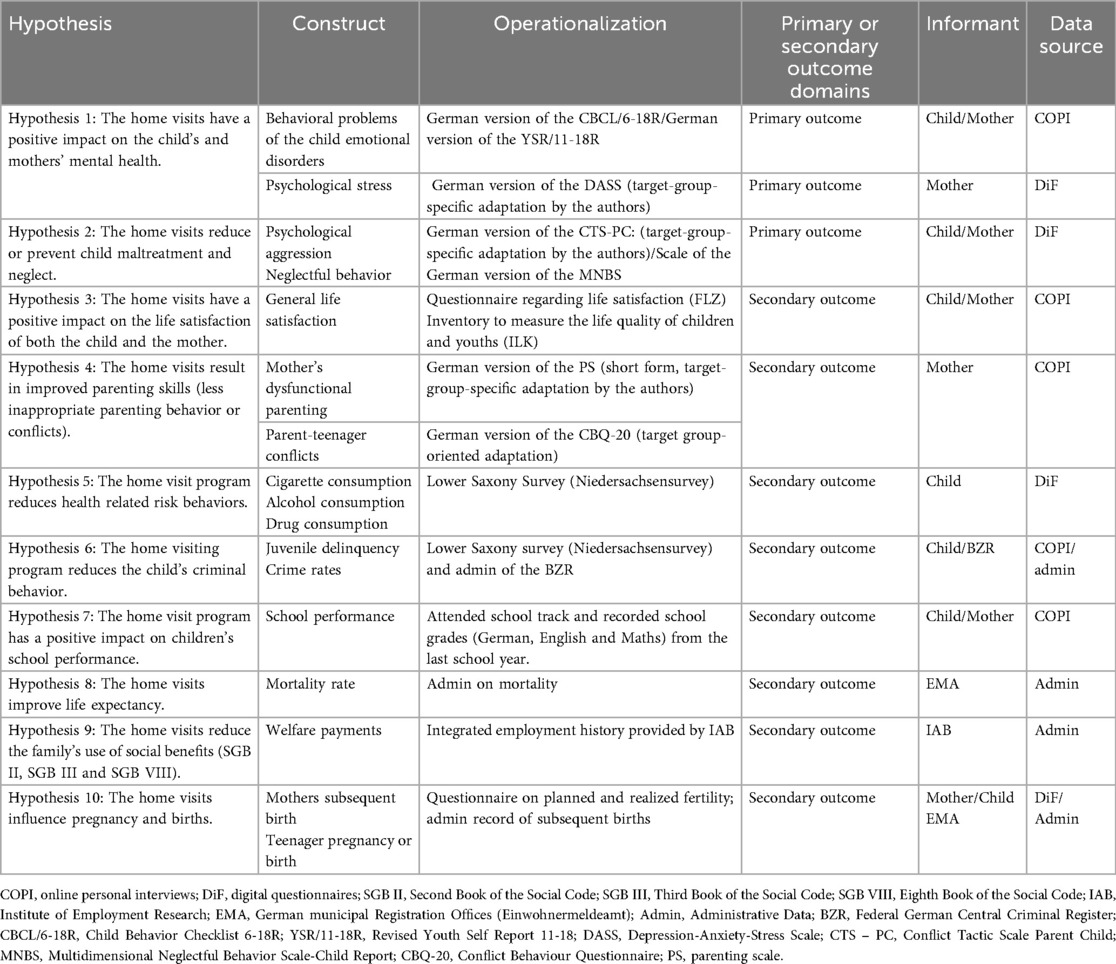 Table 1 summarizes the outcome hypotheses along with their respective operationalizations, associated informants, and survey methods. The selection of instruments and scales was guided by criteria of high psychometric quality, validity, and appropriateness. All instruments employed are particularly suited to measuring family health, living conditions, and child development. Following a multi-informant approach, various tools were used to incorporate the perspectives of both the child and the mother. A key consideration is whether the underlying research questions are (a) based on a direct outcome hypothesis of the “Pro Kind” program (primary outcome), (b) based on an outcome hypothesis but considered less likely (secondary outcome), or (c) pertain to a construct measured for further research purposes but not regarded as a primary target criterion of the intervention. Due to the volume of data collected, only the primary and secondary outcome domains are presented.