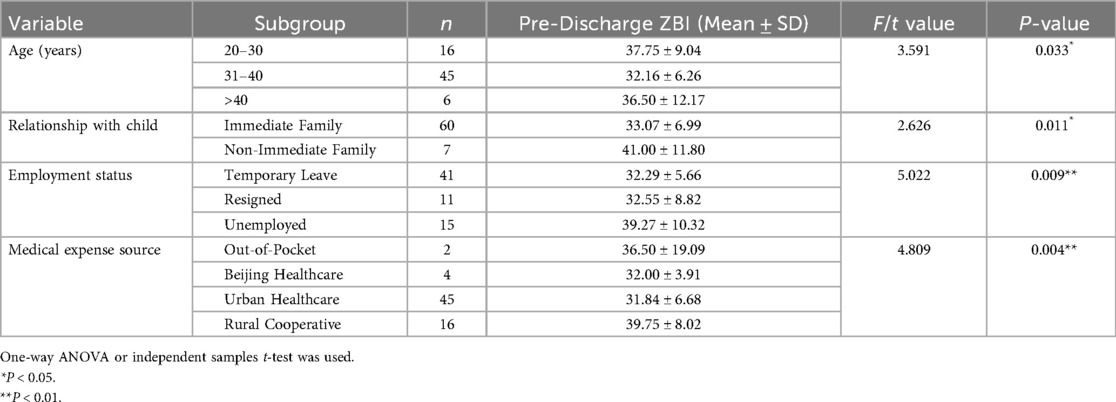 Caregivers with the following characteristics had significantly higher pre-discharge burden: aged 20–30 years (37.75 ± 9.04), non-immediate family relationship (41.00 ± 11.80), unemployed (39.27 ± 10.32), and out-of-pocket medical expenses (36.50 ± 19.09) (all P < 0.05) (Table 3).