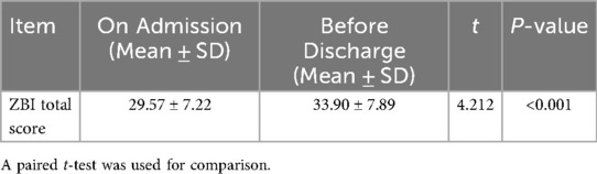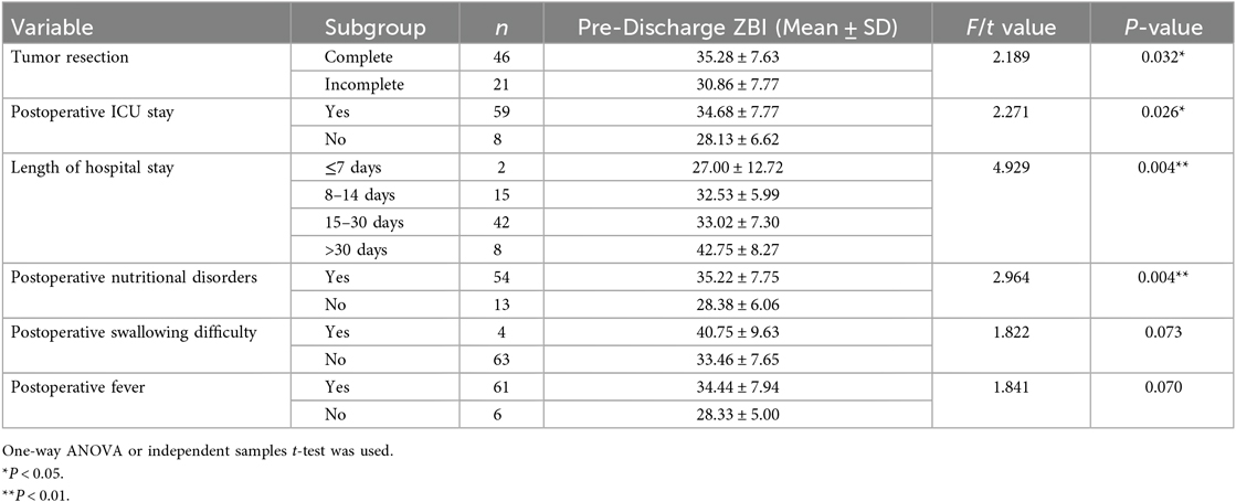 Most caregivers presented with mild burden (20–39 points) upon hospital admission (89.55%, 59/67) and prior to patient discharge (73.13%, 49/67) (Table 1). In contrast, the proportion of caregivers with moderate burden (40–59 points) increased from 5.97% (4/67) on admission to 25.37% (17/67) before discharge. No cases of severe burden (≥60 points) were observed. The ZBI scores prior to discharge were significantly higher than those upon admission (Table 2), confirming a dynamic increase in caregiver burden during the perioperative period.