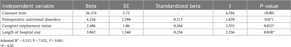 Three factors explained 21.5% of the variance in pre-discharge burden (adjusted R2 = 0.215): (1) postoperative nutritional disorders (β = 0.213, P = 0.071, near significance); (2) caregiver employment status (β = 0.264, P = 0.022); (3) length of hospital stay (β = 0.256, P = 0.028) (Table 4).
