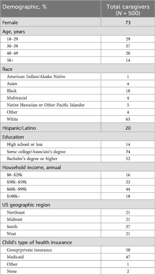A total of 3,084 individuals logged in to the survey, 690 passed the eligibility screening, and 500 caregivers completed the survey. The majority of caregivers were aged 18–39 years and female (Table 1). There was a diverse representation of races, and 20% of caregivers identified their ethnicity as Hispanic/Latino (Table 1). Over a third of participants lived in Southern US states and approximately half had a Bachelor's degree or higher (Table 1).