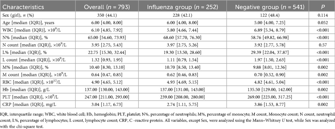 This study included 541 cases in the Influenza group and 252 cases in the negative group, with no statistically significant differences in age and gender distribution between the two groups (P > 0.05). There were statistically significant differences in WBC, N%, L%, LC, RBC, M%, MC, Hb, PLT, and CRP between the two groups (P < 0.05) (Table 2).