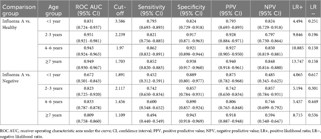 ROC curve analysis (Figure 2B) showed that LC had the highest diagnostic accuracy for Influenza A, with an AUC of 0.803 (0.770–0.834) and an optimal cutoff value of 1.479 × 109/L. Considering the variations in normal LC levels across different age groups, separate analyses were conducted for each group. For children under 1 year of age, the AUC was 0.672 (0.501–0.843), with an optimal diagnostic threshold of 1.891 × 109/L; for children aged 2–3 years, the AUC was 0.823 (95% CI 0.725–0.920), with an optimal diagnostic threshold of 2.117 × 109/L; for the 4–6 year group, the AUC was 0.833 (95% CI 0.787–0.877), with an optimal cutoff value of 1.456 × 109/L; and for the ≥7 years group, the AUC was 0.809 (95% CI 0.758–0.859), with an optimal threshold of 1.109 × 109/L (see Table 3).