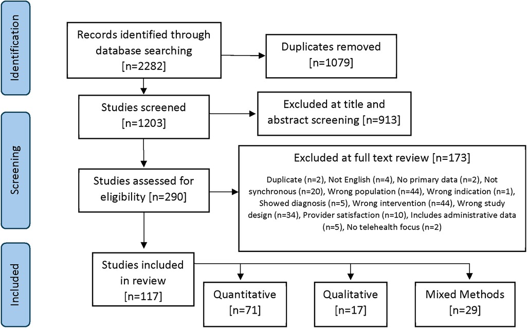Following full-text review, a total of 117 articles, as noted above, were included in this review. Through an iterative process, we generated a table to document specific features of existing studies. These articles were independently coded for retrieval of the following information: study/article title, year of publication, author(s), country, study objectives, research questions/hypothesis, study design, data collection methodology, sample size, sample characteristics, purpose of study, definition of virtual care approach, subspecialty in which approach was studied, how approach was implemented, analysis methods, outcomes, key recommendations, and study strengths and limitations. Two reviewers (RTZ, SS) extracted and analyzed the data. Given that this initiative was a scoping review, we did not appraise study design methods.
