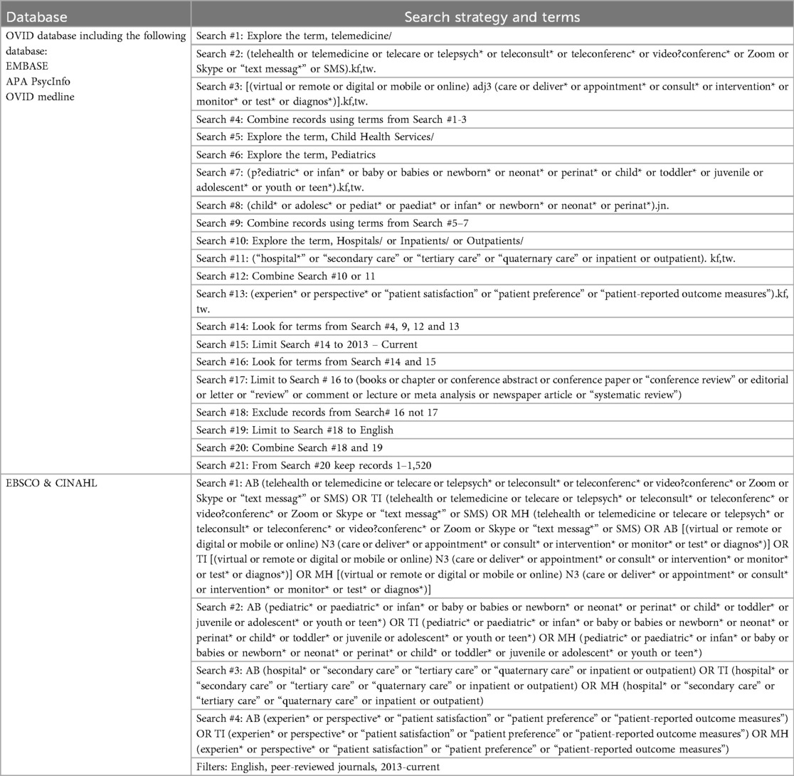 The scoping review was informed by guidelines outlined by the Joanna Briggs Institute (JBI) (26, 27). A search of the literature published between January 1, 2013, and December 31, 2023, was led by a research colleague with expertise in scoping reviews using APA PsycInfo, CINAHL, EBSCO, Embase, and MEDLINE electronic databases. Search terms were as follows: virtual (e.g., telemedicine, telehealth, telecare, teleconference, Zoom), pediatrics (e.g., infants, child, toddler, adolescent, youth), hospital (e.g., secondary care, tertiary care, inpatient, outpatient) and experience (e.g., perspectives, satisfaction, preferences) (search strategy in Table 1). Study inclusion criteria were: (1) peer-reviewed, (2) published in English, (3) focused on pediatric synchronous virtual care (e.g., online and/or phone) based on the following definition, “.real-time, virtual, direct-to-patient appointments. Synchronous telehealth happens in live, real-time settings, in which the patient interacts with a provider(s), usually via phone or video. Providers and patients communicate directly, often resulting in a diagnosis, treatment plan, and/or prescription” (28), (5) inclusive of pediatric patients (including birth to 18 years) and/or their family, (6) inclusive of primary data (e.g., surveys, interviews), and (7) inclusive of outcomes of family satisfaction, preferences and/or perspectives about the virtual care approaches. Exclusion criteria consisted of: (1) conference/meeting, proceedings, congress, guidelines, dissertation, or a review (e.g., literature review, systematic review, scoping review, meta-analysis), (2) sole focus on healthcare provider perspectives, (3) only administrative data provided, (4) development of a test or model of virtual care, and/or (5) focus on obstetrical care. At the last stage, when we extracted information from a full text review of each article, we examined how SDOH were addressed, including equity considerations (29, 30). Addressing these considerations emerged as critical in bringing an equity, diversity, inclusion, and accessibility (EDIA) lens to this work, in terms of interrogating study inclusion of diverse groups relative to the utility, impact and experience of virtual care. For reviews such as this current one, an EDIA lens can highlight how marginalized groups may experience unique challenges in accessing care.