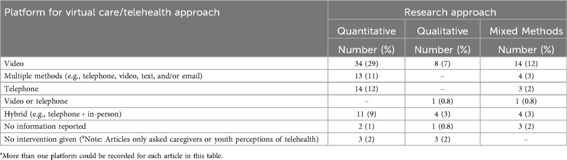 Many articles (n = 14; 12%) used a range of approaches from which patients and families could choose (e.g., videoconferencing or telephone calls), based on what worked best for the child and family. In some articles (n = 17, 15%), parents/caregivers were required to gather and upload child/patient information to an online portal or send it via email pre/post appointment. For instance, a telemedicine cardiac program offered education and support through telephone mediation and required families to upload their child's health data via an app prior to a clinical visit (31). Some articles (n = 17, 15%) contrasted modalities (e.g., in-person vs. virtual) to determine if virtual care was a viable option based on satisfaction and/or care outcomes.