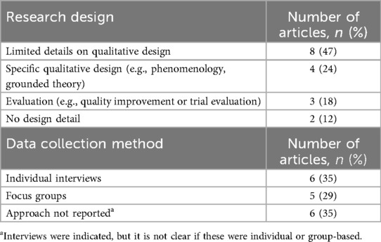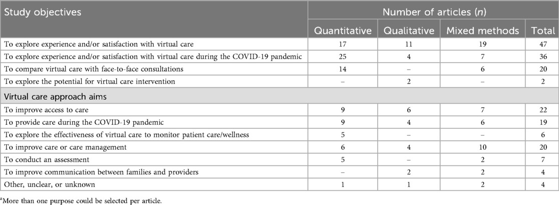 A common aim across articles was to contrast virtual care with face-to-face care approaches (n = 20, 17%). In some articles (n = 19; 16%), virtual care was developed to seek continuity of care and/or offer care during the COVID-19 pandemic. Varied study objectives and virtual care approach aims are outlined in Table 3, with several articles having multiple aims.