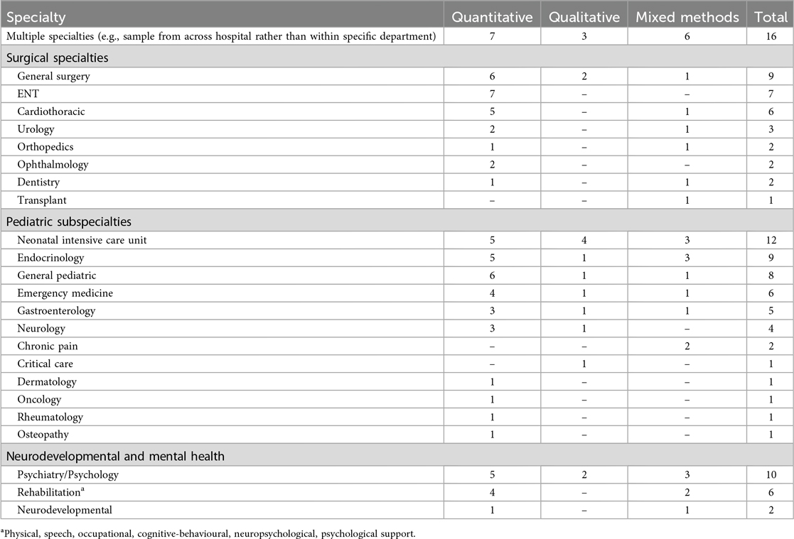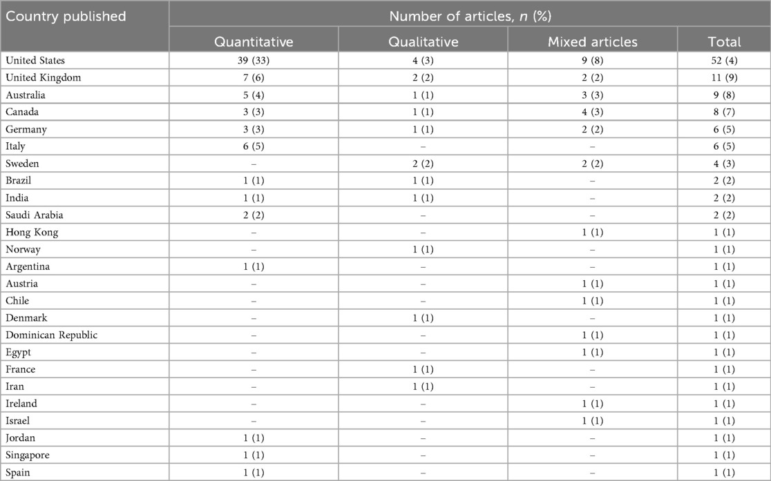 As shown in Table 4, articles were led by varying disciplines and specialty areas. Virtual care experiences were largely gathered from family caregivers solely (n = 47, 40%), from both family caregivers and children/youth (n = 57, 49%), and from children/youth solely (n = 15,13%). Most articles were published after 2019 (2 articles in 2013, 3 in 2015, 1 in 2016, 2 in 2017, 3 in 2018, 6 in 2019, 23 in 2020, 25 in 2021, 32 in 2022, and 20 in 2023). The number of articles remained relatively stable from 2013 to 2019, with an average of 3 per year. However, from 2020 to 2023 this number exponentially rose to a mean of just under 25 per year. This rapid rise likely reflects the limited in-person care available during the COVID-19 pandemic; hence, heightened attention devoted to virtual care as a common care offering and requisite. Notably, 63% of the total articles included quantitative approaches (33–75) that drew on data collected during the COVID-19 pandemic (based on pandemic dates of March 2020 to May 2023 (32), as noted above.