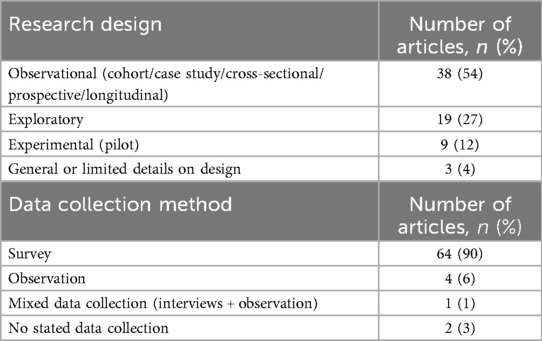 Articles were conducted in various world regions; however, almost half were based in the United States (n = 52, 44%; Table 5). Methodologies varied across articles. Quantitative articles tended to evaluate virtual care, using a range of approaches including observational design (cohort/case study/cross-sectional/prospective/longitudinal) (n = 38, 54%) (33–35, 38–41, 44, 47, 48, 53, 54, 56, 58–60, 62–66, 68, 70–72, 76–87), exploratory design (n = 19, 27%) (37, 42, 45, 49, 50, 55, 61, 69, 88–99), and experimental design (n = 11, 15%) (36, 49, 51, 87, 100–103) [Table 6]. Methods of data collection in articles almost exclusively used surveys (n = 64,90%) (33–44, 46–48, 51, 53–57, 59, 61–66, 68–70, 72–74, 77–79, 81–85, 88, 89, 91, 92, 95, 97, 98, 100–106), measured with Likert scales and/or dichotomous responses, although observation data (n = 4, 3%) (45, 60, 80, 87) were also collected (e.g., indication of improvement in health between admission and discharge via observation of cardiovascular endurance), along with mixed methods (e.g., survey and observation) (n = 1, 1%) (52).