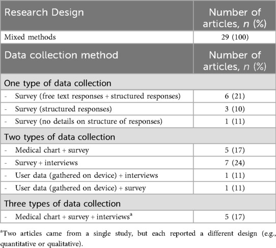 Qualitative articles elicited participant experiences and/or perspectives about virtual care [Table 7]. These articles utilized a range of qualitative approaches such as phenomenology (107, 108) and grounded theory (99). Two articles (109, 110) did not provide details about study design. Table 8 summarizes data collection methods in articles using mixed methods approaches.