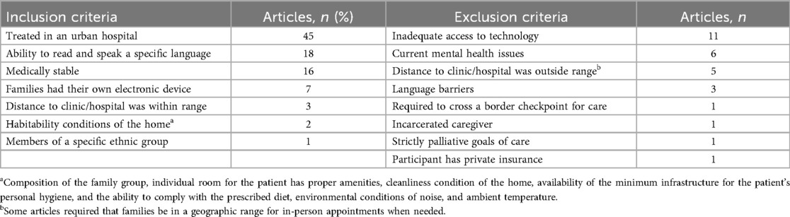 Geographically, articles tended to reflect work in urban hospitals (n = 45, 38%), and often did not include participants living in rural or remote communities. Inclusion criteria varied regarding participants’ ability to read and speak a specific language (e.g., English or Spanish; n = 18, 15%). Study participants/families were variably required to have an electronic/technology device (n = 7, 6%), thus were rendered ineligible from study participation if lacking technology and/or technology access (n = 11, 9%). Such inclusion requirements systematically decrease representation of families with lower socioeconomic status and/or less access to the Internet.