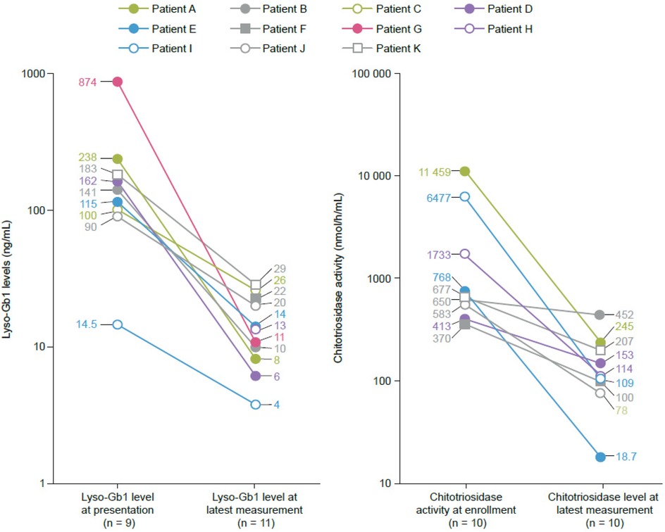 Lyso-Gb1 levels were 90–874 ng/mL at presentation in the eight patients with available measurements (normal values: <0.05 ng/mL). Chitotriosidase activities were 370–11 459 nmol/h/mL in nine patients (normal values: mean, 20 nmol/h/mL; upper limit, 120 nmol/h/mL). Two patients had chitotriosidase activities below the normal mean at presentation, attributed to variants in the chitotriosidase gene, and thus were not followed up further (21). There was a rapid decrease in Lyso-Gb1 levels from presentation values in the 6 months after starting therapy, with clinically acceptable values of 4–26 ng/mL at the latest measurement (Figure 1). For one patient (K), who only received velaglucerase alfa for 6 weeks before study closure, Lyso-Gb1 levels decreased from 183 ng/mL to 29 ng/mL. Chitotriosidase activity levels decreased in all nine patients and were below the upper limit of normal (120 nmol/h/mL) at the latest measurement in five patients (Figure 1). After an initial decrease, one patient (B) had an increase in chitotriosidase levels to 2,272 nmol/h/mL, attributed to a history of recent SARS-CoV2 infection, which was sustained for some weeks before starting to decrease again.
