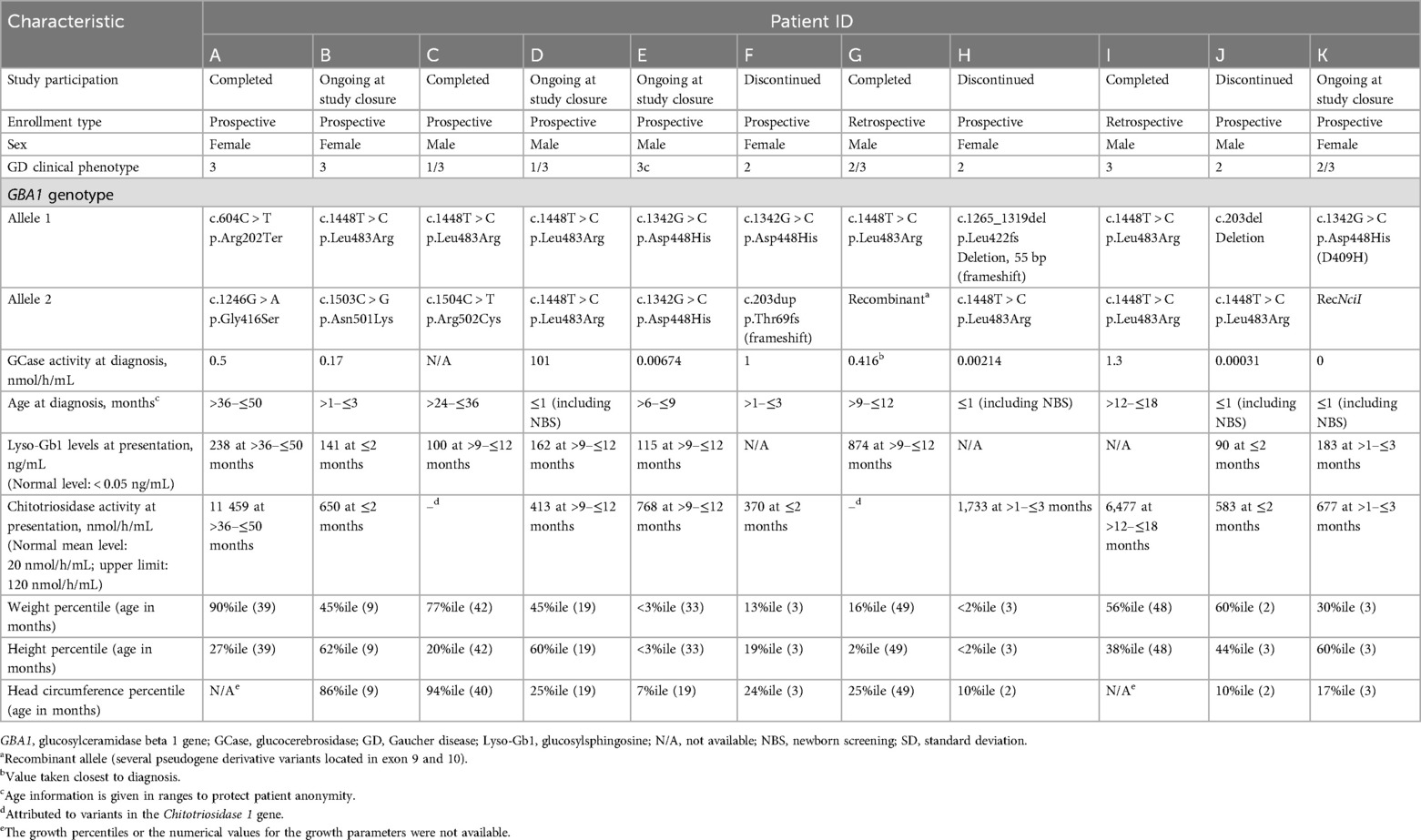 There are limitations to our report. First, the findings are based on a small number of patients. Twenty patients were planned to be included; however, the study was closed early after almost 2 years of enrollment, owing to challenges in part attributable to the COVID-19 pandemic. Indeed, in a survey of healthcare professionals involved in the Fabry, Gaucher, and Hunter Outcome Survey registries, over 80% of respondents were concerned that the reliance on virtual consultations during the pandemic had, to some extent, resulted in delays in diagnosis of lysosomal disorders (51). The known and considerable heterogeneity of disease presentations in GD was also evident in our population because three patients developed progressive signs and symptoms consistent with GD2 after initially being considered to be eligible for the study. Second, since patients were treated in accordance with the physician treatment plan per standard clinical practice at the center, follow-up visits were based on the needs of the patient rather than a regular protocol-defined schedule, and not all outcomes were assessed at each of the visits. Finally, we acknowledge that this is an observational study without a comparator arm.